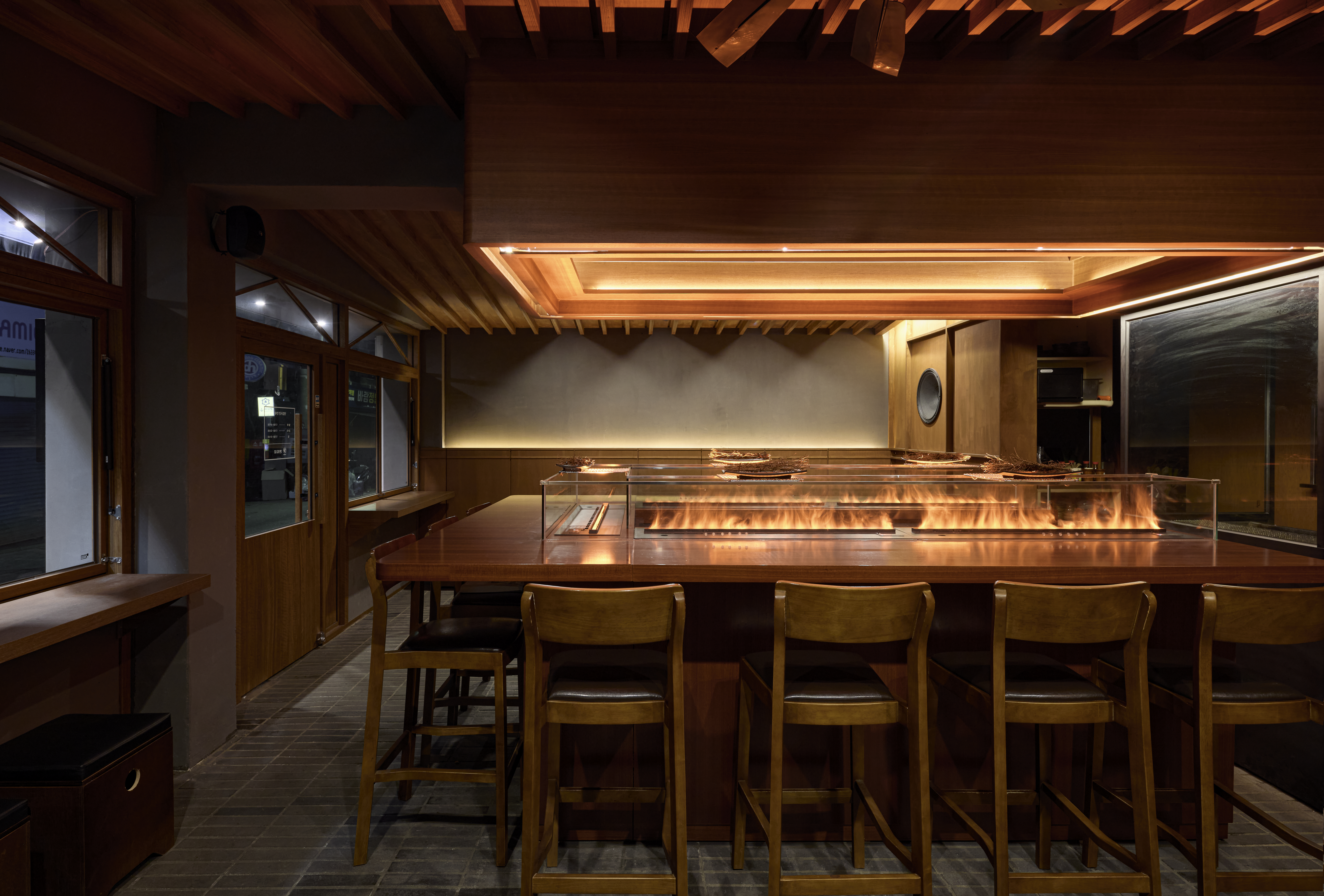 지붕이라는 공간요소, 돼지고기라는 국민메뉴, 익숙한 돼지고기 익는 냄새까지. 보편적인, 평범하고 익숙한것들이 모여서 주는 적당한 근사함이 매력적인 공간입니다. 공간에 들어서면 눈길을 사로잡는 바테이블의 화염 디스플레이를 톤토로만의 강력한 시그니처 포인트로 제안하였습니다. 돼지고기 특수부위를 주력으로 하는 전문성이 드러날 수 있도록 주인장이 직접 고기를 굽는 중앙 화로대를 과감히 노출시키고, 채도가 낮은 우드톤으로 캐쥬얼하고 편안한 공간을 구성하였습니다.